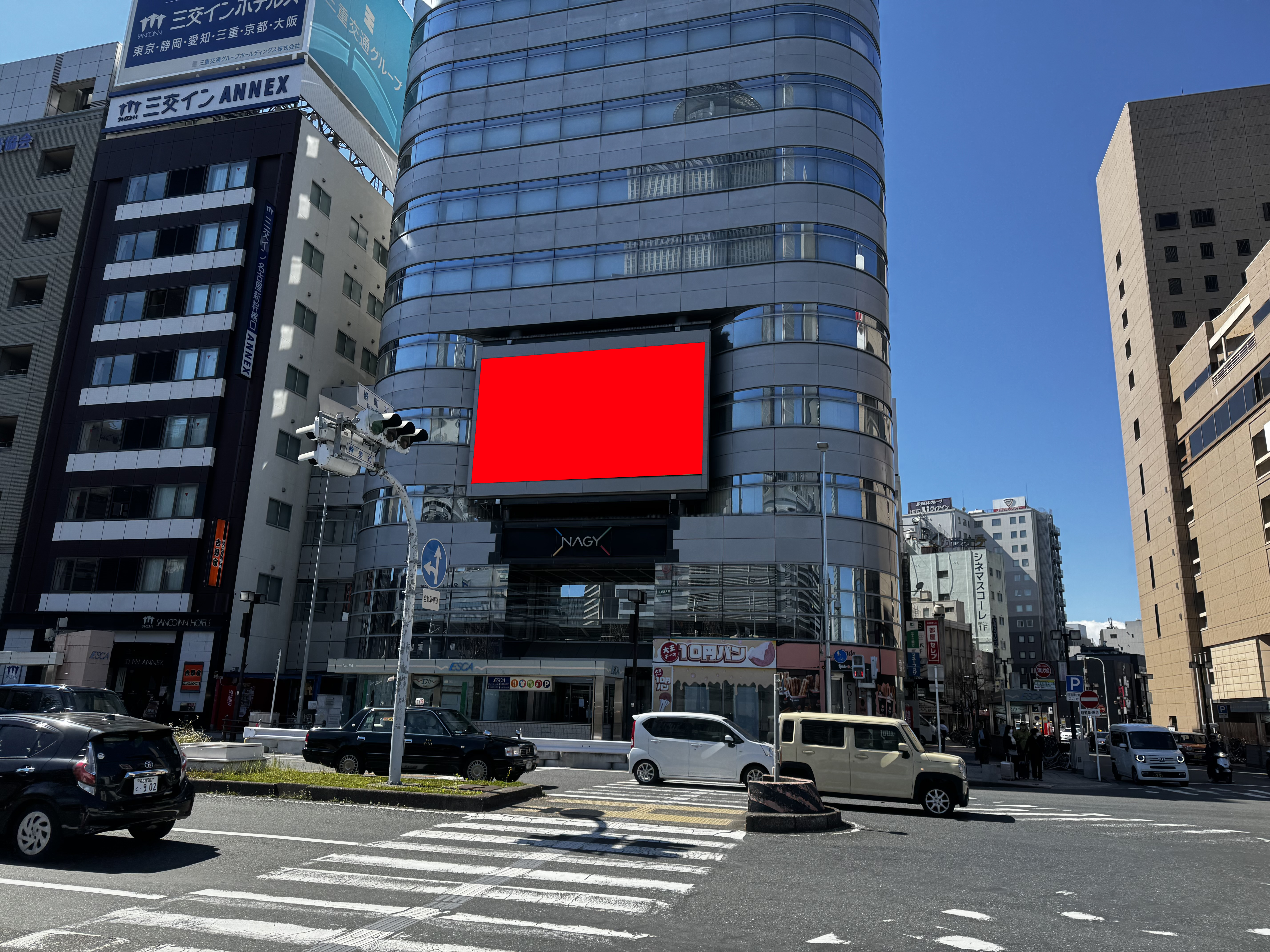名古屋駅太閤口前に設置されています。目の前が広場となっており、視聴者の滞留時間が長い媒体と言えます。ビル隣はビックカメラで付近にはビジネスホテルも多い事から、比較的男性が多く見られるエリアとなります。東海道新幹線のホームからも視認可能です。