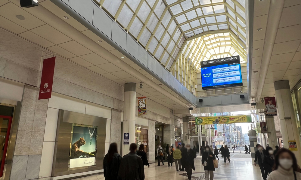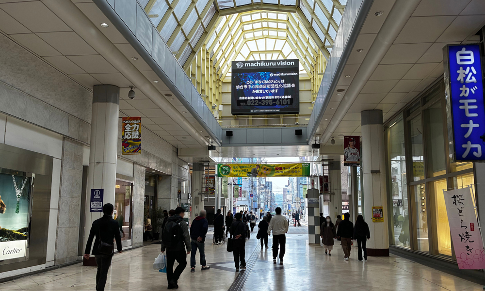 仙台市中心部商店街の“マーブルロードおおまち商店街”内に設置された媒体です。設置位置が高い為、遠くからも目に入ります。地元の百貨店「藤崎」もあり、商店街は地元の買い物客で終日賑わっています。オールターゲットにアプローチが可能です。