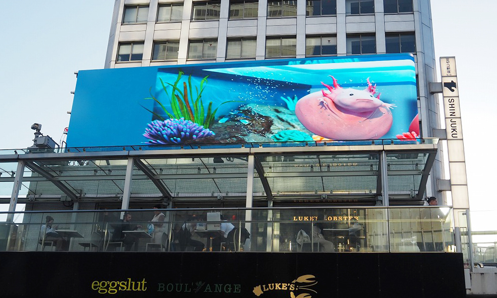 バスタ新宿の横、新宿駅南口前のサザンテラス入口に設置された3D対応のL字型の大型ビジョンです。設置位置が低いため、通行者導線の視界に入りやすく、迫力の映像と音声での情報発信が可能です。