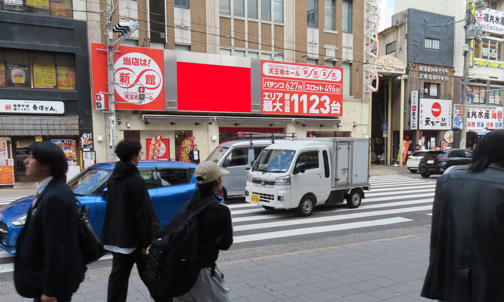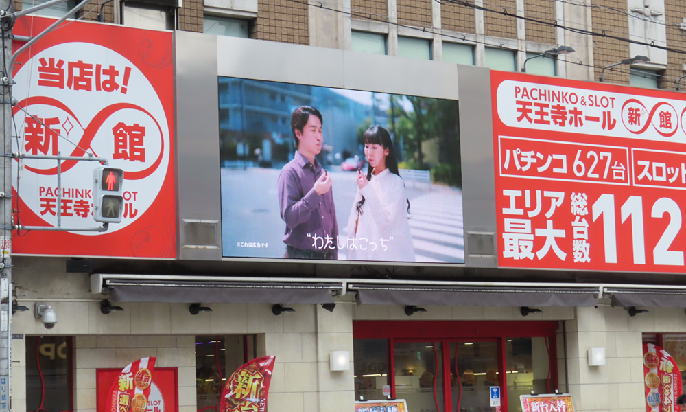 天王寺駅の北口駅前に設置された媒体です。各交通網が集中するターミナルになっており、その周辺はキタ・ミナミに次ぐ規模の繁華街であり、天王寺MIO・あべのハルカス近鉄本店・あべのキューズモール等があります。老若女男問わず賑わいを見せています。